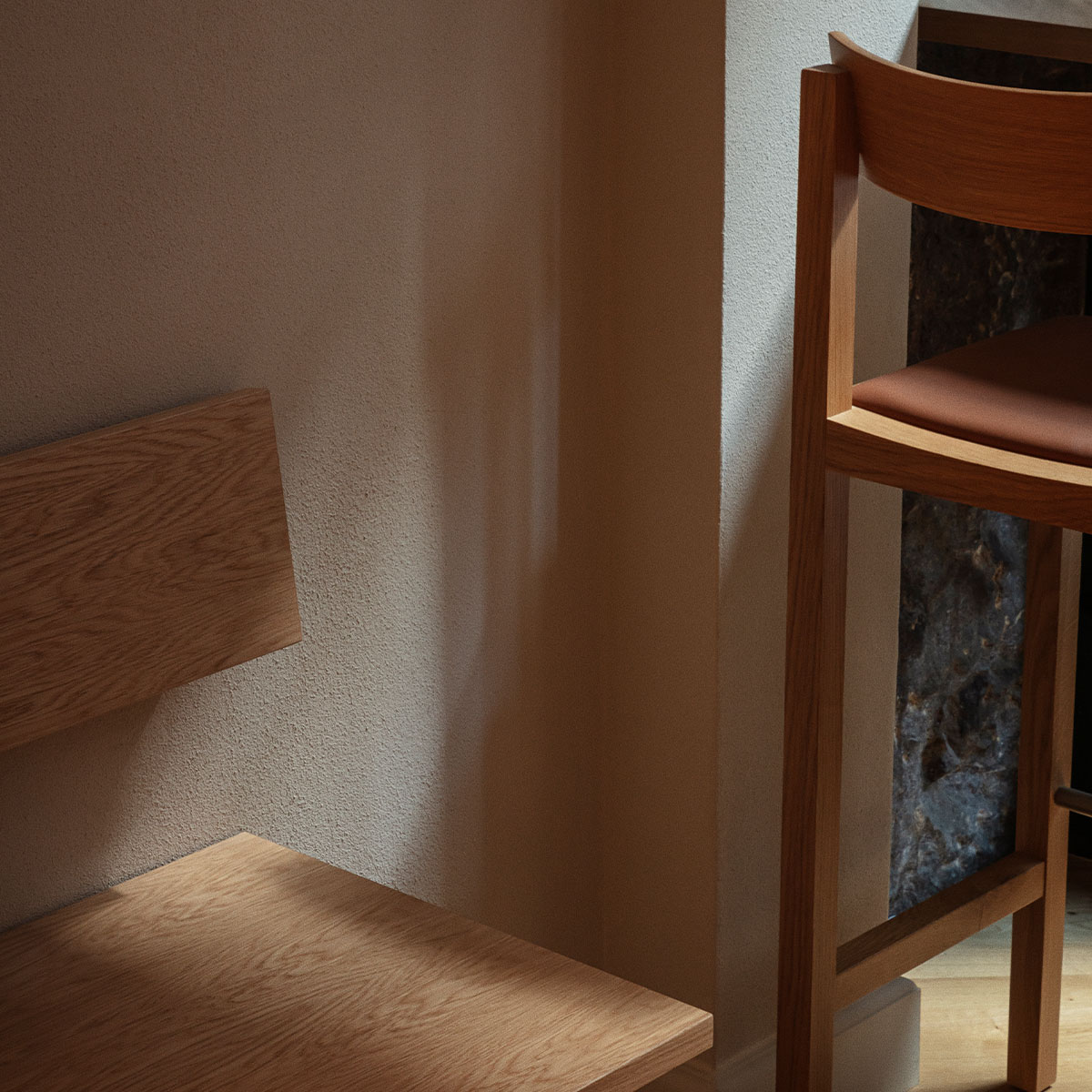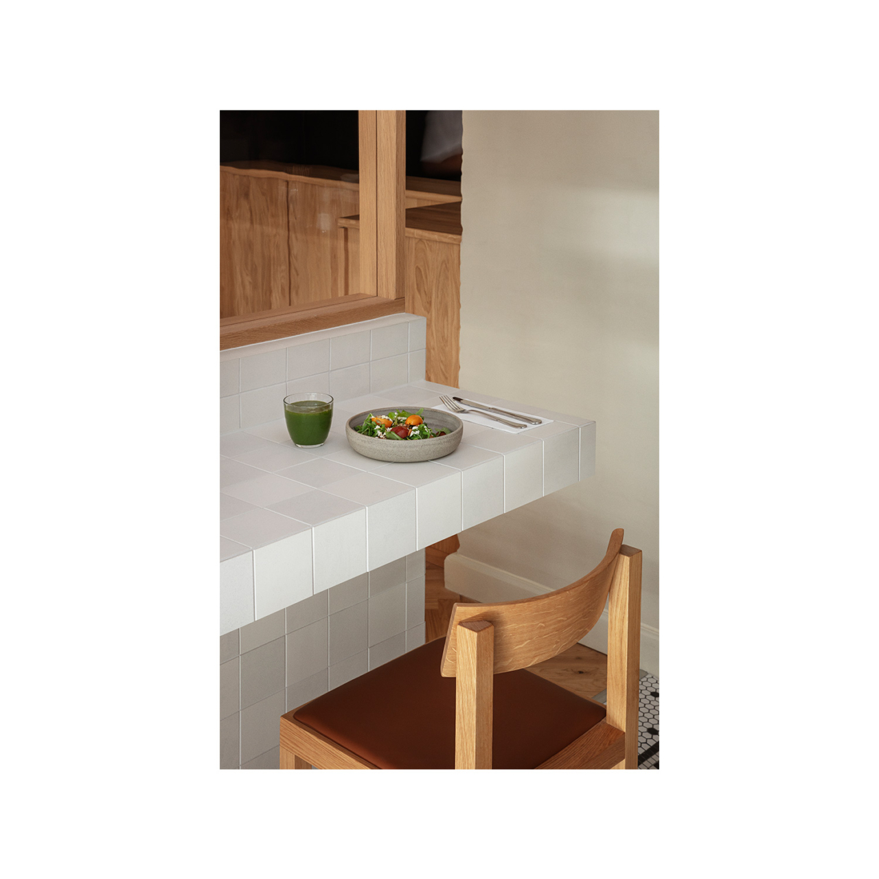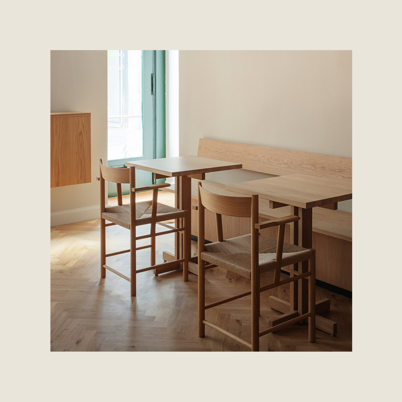 As part of the redesign, the F Chair was thoughtfully selected for its balance of functionality and refined character. Its sculptural silhouette and crafted wooden frame complement the café’s tactile materiality, while its comfort makes it ideal for long stays — whether guests are working, meeting, or simply enjoying a moment alone.