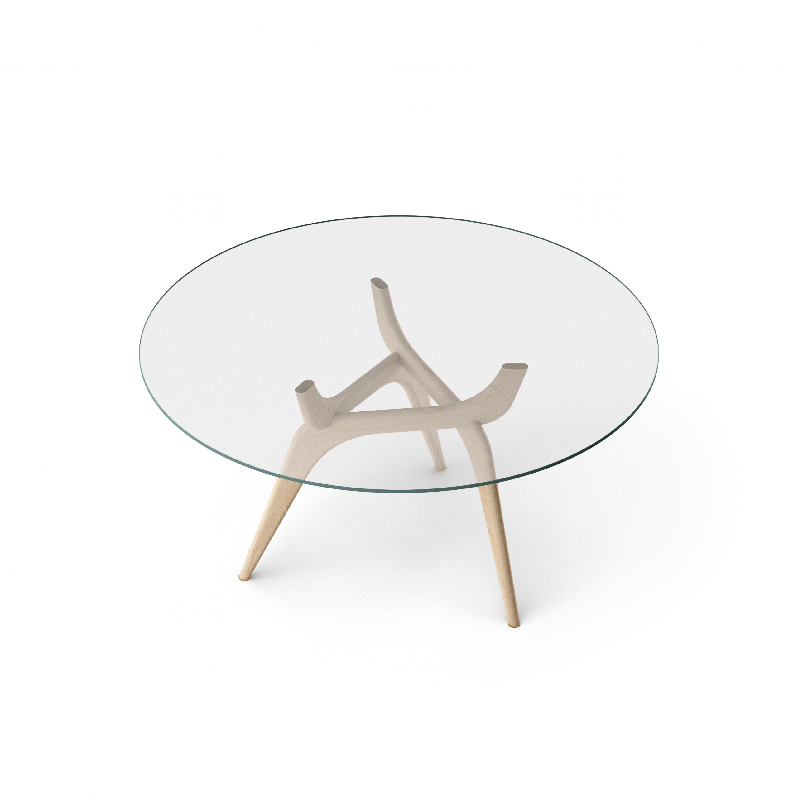 In 1958, Danish architect Hans Bølling sketched a table that blends playful construction with sculptural elegance. Today, Brdr. Krüger brings this vision to life in the TRIIIO Dining Table, where a twisted oak base—reminiscent of growing tree branches— meets a floating glass top, creating a poetic balance between function and form.