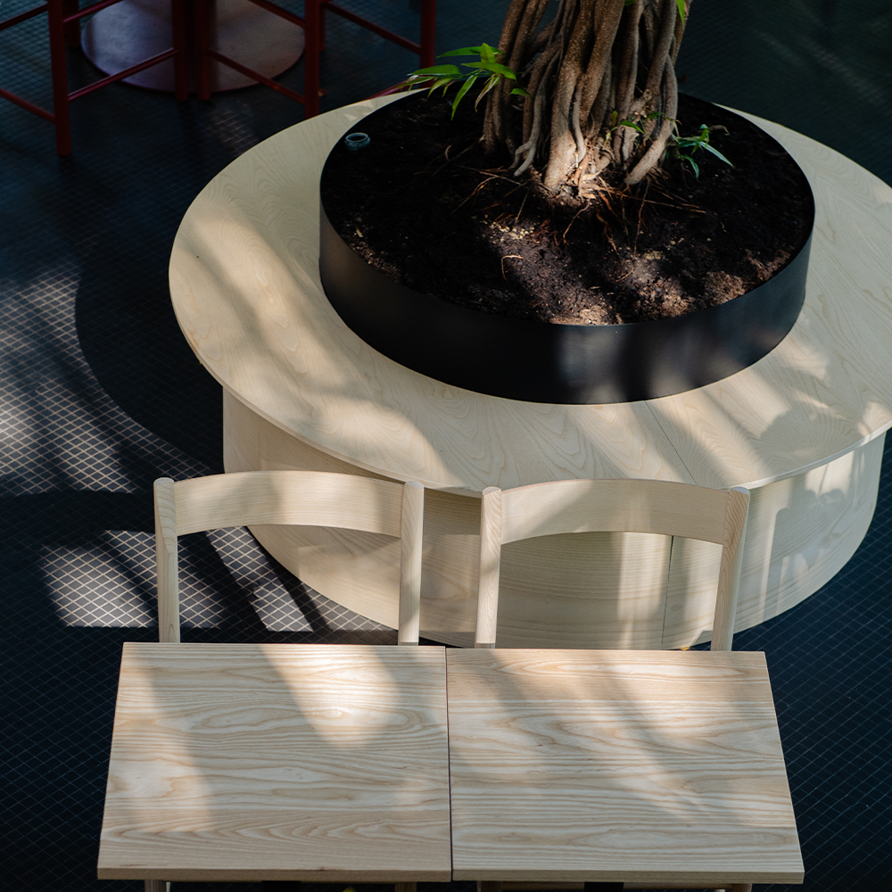 The material palette includes natural ash wood for the café chairs—designed by Brdr. Kruger—tables, benches, shelving and counters. The light tone of the ash offsets the dark flooring and establishes a welcoming atmosphere.