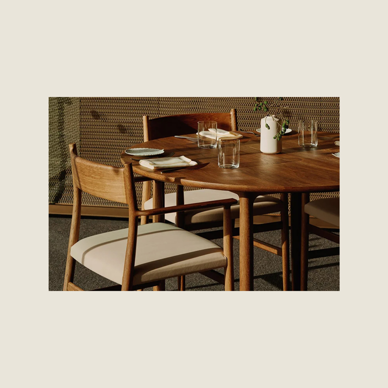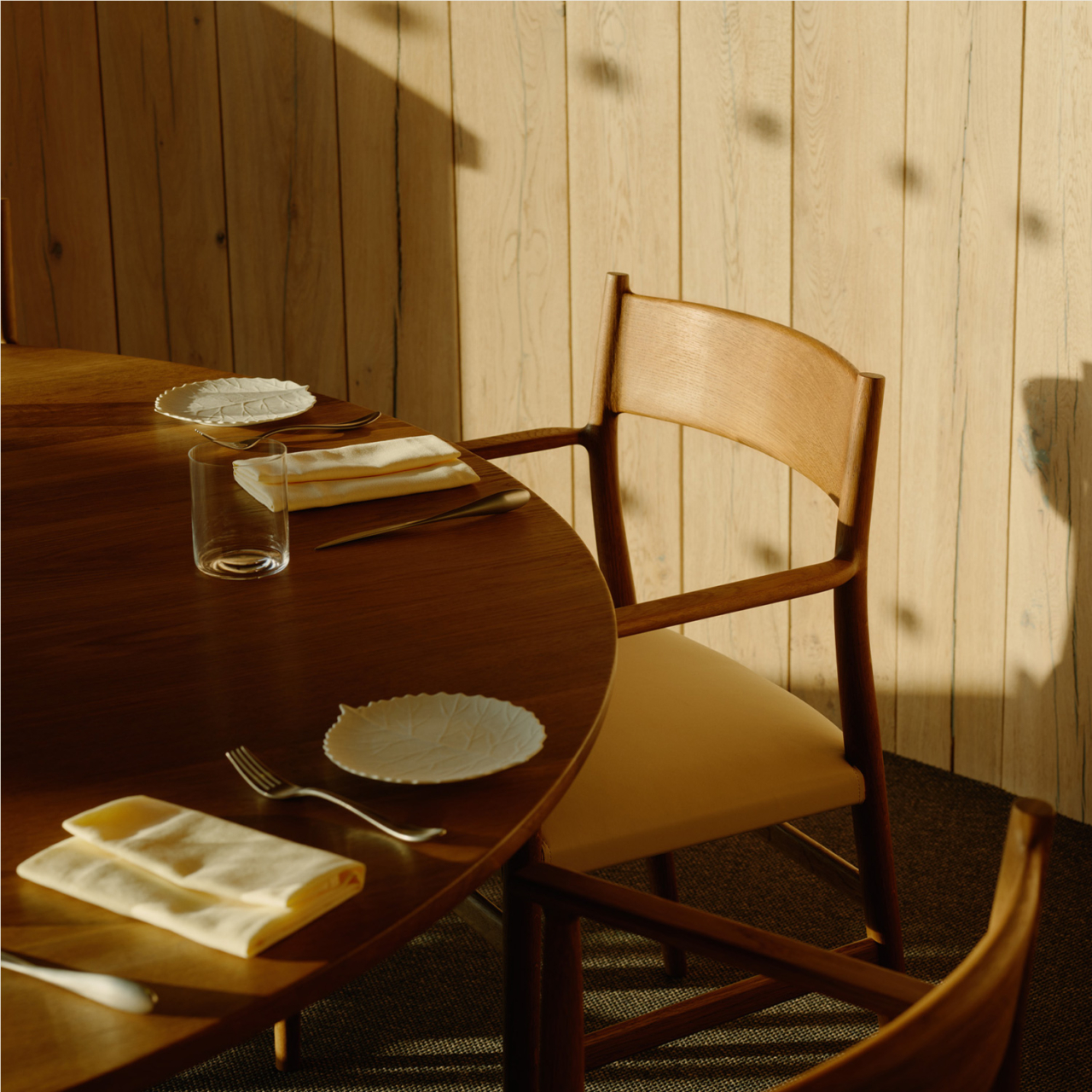 For TimeSpirit, Thulstrup selected the fumed oak ARV Tables, complemented by bespoke ARV Chairs upholstered in his own design of Sørensen’s Flux leather. The material palette is both tactile and timeless, balancing sophistication with warmth—inviting guests into a space where every element tells a story of care, craft, and legacy.